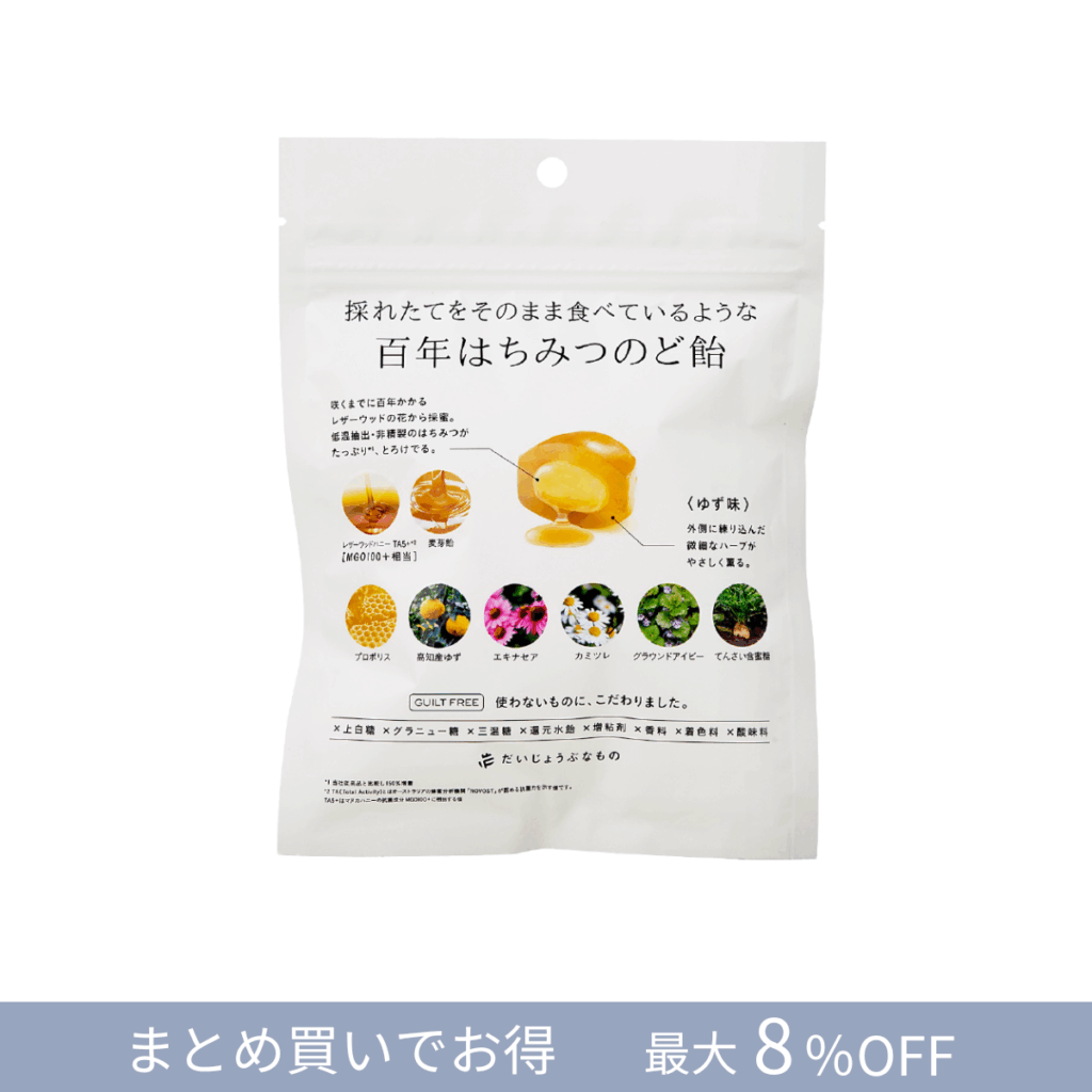 ゆずの酸味と百年はちみつの甘味がバランスよく設計された、添加物フリーの「究極の飴」。