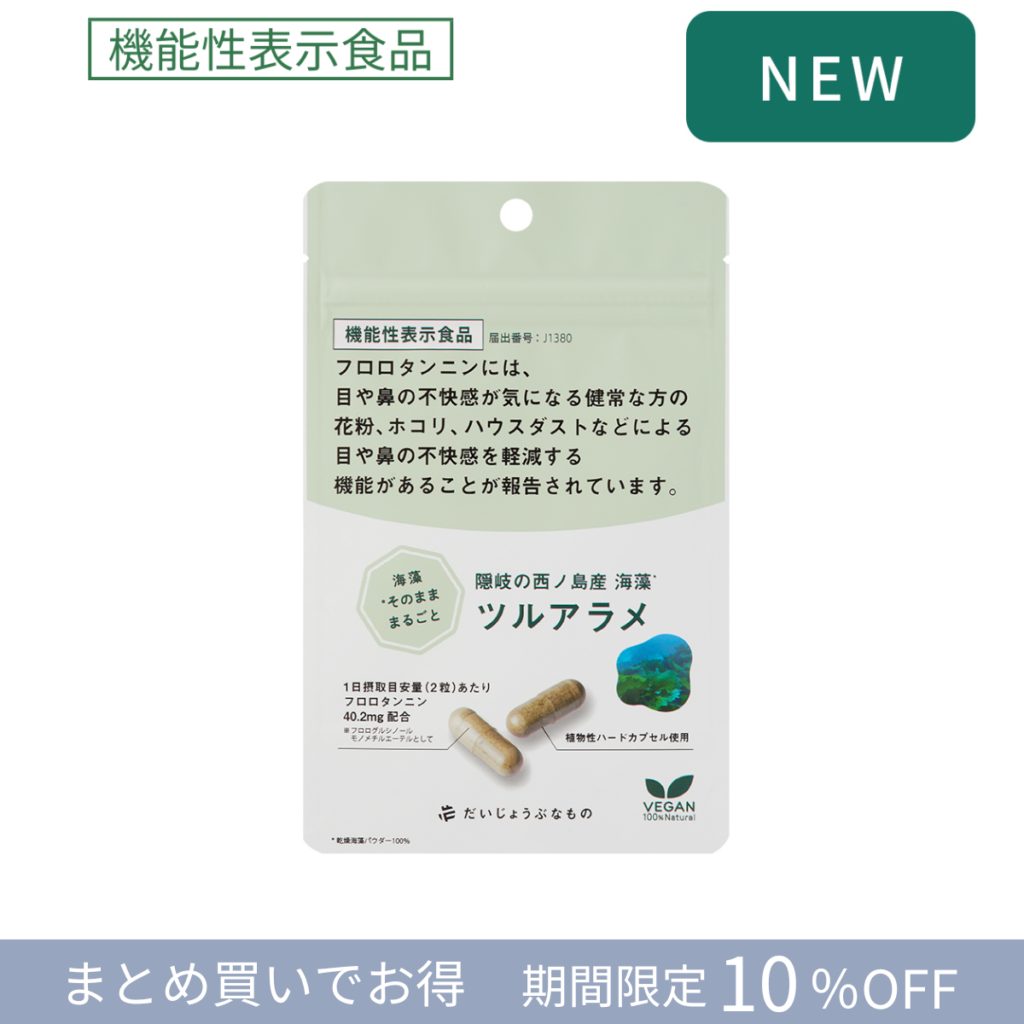 花粉・ホコリ・ハウスダストによる目や鼻の不快感に。機能性関与成分フロロタンニン[届出番号 J1380]を1日2粒で40.2mg配合。