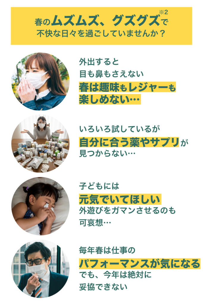 ムズムズ、グズグズに悩まされる春※2、お薬が手放せない方は多いでしょう。一方で、人それぞれ体質や生活リズム、仕事や学業の予定も異なり、お薬だけで万全とは言い切れない場面もあります。毎日の食生活を充実させ、内側からコンディションを整える視点が大切です。