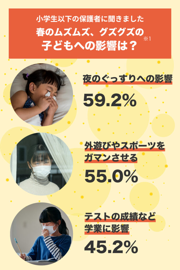 当社が行った調査では、自覚症状を持つ小学生以下のお子さんの保護者のうち、半数以上が「夜ぐっすり眠れないことがある」と回答しました。ほかにも、何かと春の不調が子どもの生活を制限しているようです。