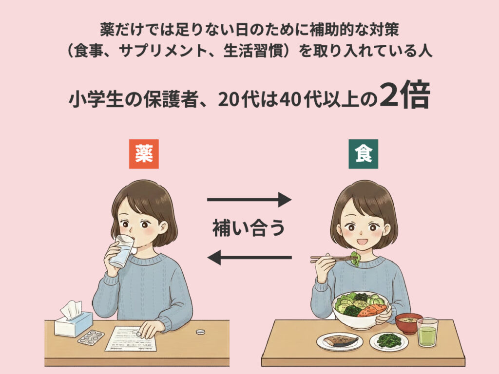 私たちの調査では、若い世代ほどサプリメントの摂取や食事の工夫への意識が高いことがわかっています。難しい春の体調管理は、薬だけでうまくいくとは限らず、薬と食で相互に補うことが大切です。